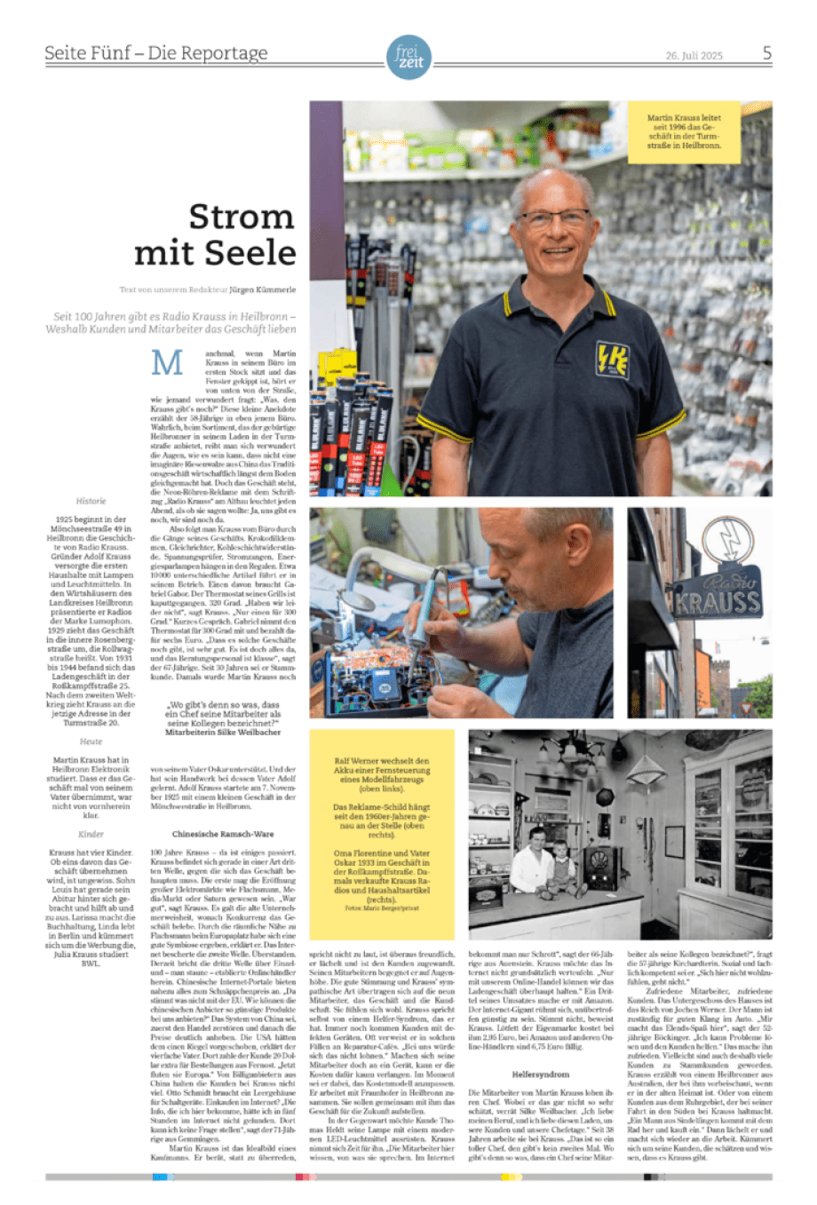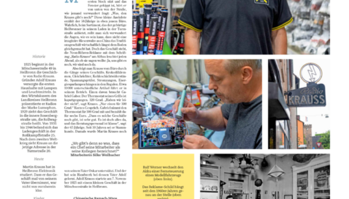 Krauss Elektronik ist ein traditionsreiches Familienunternehmen aus Heilbronn, das seit 1925 besteht. Ursprünglich als Akkuladen gegründet, entwickelte sich der Betrieb über Elektroinstallationen und Radio-/Fernsehtechnik hin zu einem spezialisierten Fachgeschäft für elektronische Komponenten. Seit 1970 konzentriert sich das Unternehmen ausschließlich auf Zubehör für HiFi-, Computer- und Elektroanwendungen, darunter Stecker, Kabel, Leuchtmittel, Akkus und Batterien. Heute beschäftigt Kraus Elektronik neun Mitarbeitende. Die persönliche Beratung und der stationäre Verkauf bilden weiterhin das Herzstück des Geschäfts.