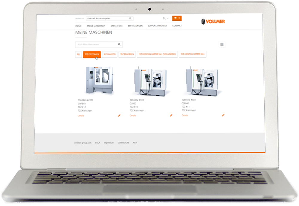 Das VPortal ist die zentrale digitale Anlaufstelle für Vollmer Kunden, sofern es um das Wohl von Vollmer Maschinen geht. Mit dem Kundenportal behalten die User stets den eigenen Maschinenpark im Blick. Ein integrierter Ersatzteilshop ermöglicht eine schnelle Ersatzteilbestellung. Zudem sind zu jeder Maschine umfangreiche Dokumentationen vorhanden. Eine schnelle und einfache Kontaktaufnahme im Servicefall durch das integrierte Ticketsystem runden das Angebot ab.